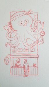 Below, you'll see the first sketch I draw and some photo references that I took when I was living in Japan. A representation of an octopus clearly visible on the storefront is a way of identifying them from afar.